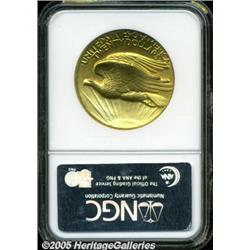 <B>1907 $20 High Relief, Flat Rim MS65 NGC.</B></I> The story of the High Relief twenties is well-known to numismatists. President Theodore Roosevelt personally asked famed sculptor Augustus Saint-Gaudens to rework several of the more uninspired coinage designs that were current in 1905. Over the next two years, in spite of declining health, Saint-Gaudens produced plaster models for the ten dollar and twenty dollar gold pieces. Each of these denominations went through several modifications before working dies were produced within the Mint that led eventually to the production of millions of gold coins. The Flat Rim variant of the High Relief is actually another minor, but significant modification that was made to the High Relief design. To produce each coin, between five and seven blows from a hydraulic press were required to fully bring up the details in the dies. However, it was soon discovered that in the striking process a tiny rim of extruded metal protruded between the die and the collar, producing the so-called Wire Rim variant. This was perceived as a problem by Mint personnel, not as an aesthetic element as it is by collector's today. The answer to the "problem" of the Wire Rim was the creation of the Flat Rim coins, pieces that had no extruded metal on either side. Such pieces are four to five times scarcer than their Wire Rim counterparts. This particular coin shows strong, bold definition throughout and the satiny surfaces are virtually free from any post-striking defects. Rarely seen in Gem condition and an important coin for advanced gold collectors. Population: 19 in 65, 18 finer (2/05).