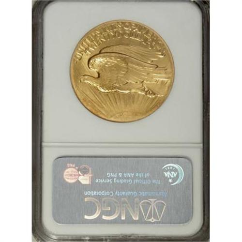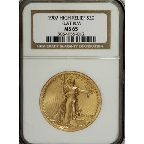 <B>1907 $20 High Relief, Flat Rim MS65 NGC.</B></I> Scholarship in U.S. numismatics keeps growing at an ever-increasing pace. Just when it seems that there are no more unexplored areas, a new ground-breaking work is published. Recently, two books were published by Roger Burdette with the common title Renaissance of American Coinage. One volume covered the period from 1916-1921 and the other 1905-1908. In the latter book, he quotes from a letter from Mint Superintendent Landis to Director Leach dated December 6, 1907, concerning the "problem" of the wire rim or burr on the High Relief twenties.<BR><BR> "I was exceedingly humiliated today to have the Secretary of the Treasury call attention to the excessive burr, or fin, on one of the new double eagle pieces now being distributed.<BR> "I was also surprised to find so many of these defective coins in a bag as I saw in the Treasurer's office here.<BR> I gave explicit orders when in Philadelphia that such coins should not be delivered, and directed the man who seemed to have the coins in charge to see that the same should all be gone over and the bad ones laid aside.<BR> "I wish you to make [an] investigation and see why my instructions were not carried out, and if there was any negligence or carelessness, who is to blame."<BR><BR> Clearly, Mint personnel at the highest levels saw the fin, burr, or as we know it today the "wire rim" as a minting flaw and sought to correct it. It was not seen as an aesthetic addition to the coin and was a source of "humiliation" as Landis indicated. In the hundred years since that time, attitudes of collectors have appreciably changed; and, in fact, it was not long after striking that collectors began to appreciate the difference between the Wire Rim and Flat Rim variants of these beautiful coins. While exact numbers are not known, it was not until December 20, toward the end of the production run for High Reliefs (in December), that Charles Barber and other members of the engraving staff completely eliminated the fin on High Reliefs.<BR> The present satiny yellow-gold Gem has a beautifully unabraded appearance and is essentially void of carbon. The strike is exquisite throughout the devices, with no sign of flatness on Liberty's raised knee or on the crest of the eagle's front wing. An exceptional High Relief, and part of a limited run of coins that have an interesting story behind it.<BR><BR><B>Coin Engraver:</B> Augustus Saint-Gaudens<BR><BR><b>Shipping:</b> Coins & Currency (<a target="_blank" href="http://www.heritageauctions.com/common/shipping.php">view shipping information</a>)