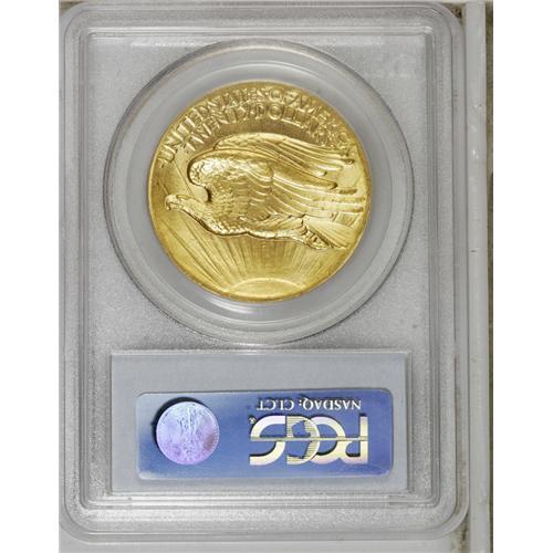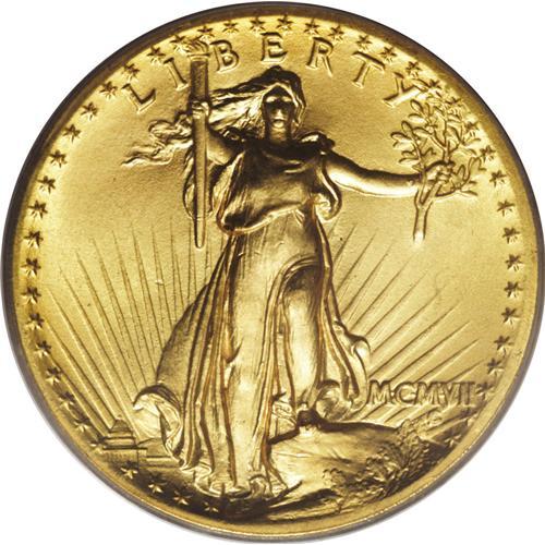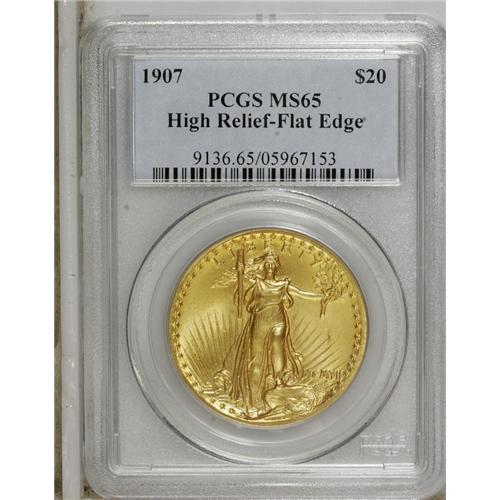 <B>1907 $20 High Relief, Flat Rim MS65 PCGS.</B></I> A gorgeous Gem that exhibits satiny yellow-gold luster with full mint brilliance, slightly brighter in appearance on the reverse. The surfaces on both sides of this beauty are remarkably fine, with only a few minuscule marks and a single tiny luster graze in the right obverse field. The strike is sharp with nearly full design definition. Both sides have extensive, swirling die polish lines as always seen.<BR> Although Saint-Gaudens created a wonderful design, it was not practical, as each coin took 12 minutes to produce. It was necessary to use the 150-ton medal press to strike these coins, and then only with three blows. The coin had to be annealed between each strike, a time consuming process. Using a single press, striking one coin at a time, it would have taken nearly four months to produce the 12,867 coins that were minted. The actual production time was not nearly so long, thus there was apparently some opportunity to batch different parts of the process, in addition to the use of multiple coin presses.<BR> The scarcity and beauty of these coins was obviously recognized from the start, and they brought a 25 to 50% premium over face value almost from the start. While the premium dropped to just one or two dollars over face value by the 1920s, it only remained at that level for a short time. Some pieces may have been spent as money became scarce during the depression. Obviously, many others were carefully preserved, much like this piece that is nearly as perfect as the date it was made.<BR><BR><b>Shipping:</b> Coins & Currency (<a target="_blank" href="http://www.heritageauctions.com/common/shipping.php">view shipping information</a>)