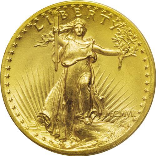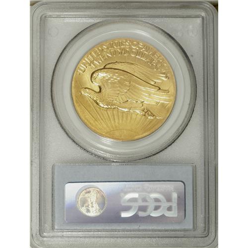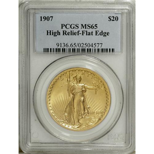 <B>1907 $20 High Relief, Flat Rim MS65 PCGS.</B></I> The thin golden fin (or "wire rim") commonly seen on earlier high relief double eagles was considered nothing less than a major defect by the mint. The fin was easily abraded and this had the potential for reducing the coin's weight to below legal standard. It was also an aesthetic problem that marred the otherwise magnificent and difficult to produce coins.<BR> Using suggestions made by Director Leach (based on his years of working with gold at San Francisco), the Philadelphia Mint changed the way they milled the coin blanks. These alterations allowed coins to be struck with almost no fin and met with full approval from Roosevelt, "The President was greatly pleased with the sample of the lot now being struck off on the Medal press." Although the coins were noticeably superior to earlier pieces, engraver Charles Barber was concerned: "All the coins now made are the same, which gives me alarm, as they are so well made that I fear the President may demand the continuance of this particular coin."<BR> Ultimately, cost and low productivity prevented more extensive coining of the high relief version. According to Roger Burdette, approximately one-third of the 12,367 pieces struck were of the finless variety. As with other High Relief twenties, they were shipped to sub-Treasuries in small bags that contained 250 pieces with little done to prevent nicks and scrapes. Only 58 High Relief coins were included with the Treasurer's little hoard of gold in 1912. All had been sold by February 1913 for an average of just $23.00 each.<BR> Of all the variations on the initial double eagle design presented to the President in December 1906, the High Relief, Flat Rim coins are closest to a golden realization of Saint-Gaudens final design. Detail, execution and overall appearance are closest to the sculptor's last Very High Relief models of March 1907. Although the much-exalted Extremely High Relief experimental pieces get more publicity, it is this--an almost accidental coin--that truly embodies the artistic collaboration of Theodore Roosevelt and Augustus Saint-Gaudens.<BR> This is a magnificent, Gem example of the Flat Rim variant. The surfaces have thick, satiny mint luster and are sharply defined, as one would expect from a coin that was struck three times with a hydraulic press. The MS65 grade, of course, precludes any noticeable or mentionable contact marks. Simply magnificent quality.<BR><I>From The Kutasi Collection.</B></I><BR><BR><b>Shipping:</b> Coin/Currency (<a target="_blank" href="http://www.heritageauctions.com/common/shipping.php">view shipping information</a>)