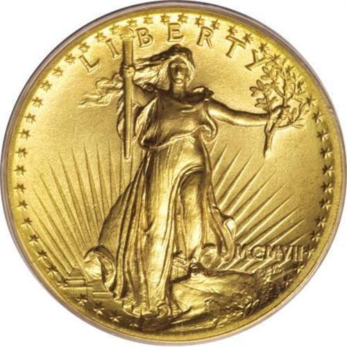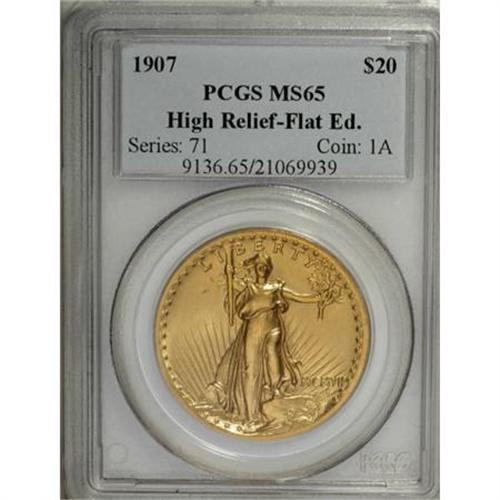 <B>1907 $20 High Relief, Flat Rim MS65 PCGS.</B></I> An extraordinary coin whose fame and remarkable beauty precedes it, the 1907 High Relief double eagle is one of the most coveted 20th century gold issues. Previously a part of the Phillip Morse Collection, this carefully preserved example is free of individually bothersome abrasions. The captivating surfaces show the usual minute, swirling die polish lines in the fields. The yellow-gold color with a slight overlay of reddish patina is also characteristic. Close examination reveals a trace of a localized wire rim at the right side of the obverse, this being characteristic of the newly modified design. The Wire Rim, so desired by many collectors today, was actually considered a defect by Mint personnel. As related in Roger Burdette's <I>Renaissance of American Coinage, 1905-1908</B></I>, the wire rim became an important issue for Superintendent John Landis when he received a letter on December 6 from Director Frank Leach stating:<BR><BR> "I was exceedingly humiliated today to have the Secretary of the Treasury call attention to the excessive burr, or fin, on one of the new double eagles now being distributed.<BR> "I was also surprised to find so many of these defective coins in a bag as I saw in the Treasurer's office here.<BR> "I gave explicit orders when in Philadelphia that such coins should not be delivered, and directed the man who seemed to have the coins in charge to see that the same should all be gone over and the bad ones laid aside."<BR><BR> Quite a strong reaction, and one that seems radical to today's numismatists as such coins are highly prized and considered a collectible striking variant. Nevertheless, the "defective coins" were largely remedied toward the end of the production run of High Reliefs, and today the Flat Rim is several times scarcer than its Wire Rim counterpart. <BR> The only noticeable break in the silky-smooth texture of the surfaces is a short horizontal contact mark across the first and second rays on the reverse. In Gem (and finer) conditions, we have seen surprisingly few Flat Rim High Reliefs over the years.<BR><I>From The Ultra Collection.</B></I><BR><BR><B>Coin Engraver:</B> Augustus Saint-Gaudens<BR><BR><b>Shipping:</b> Coins & Currency (<a target="_blank" href="http://www.heritageauctions.com/common/shipping.php">view shipping information</a>)
