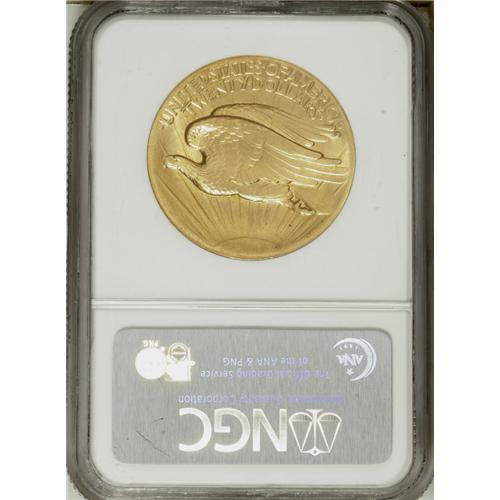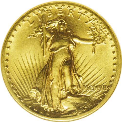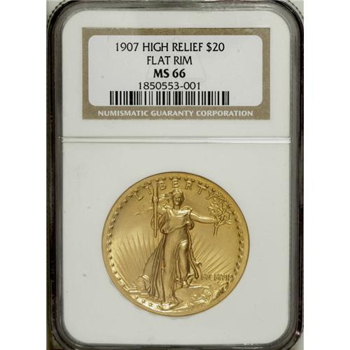 <B>1907 $20 High Relief, Flat Rim MS66 NGC.</B></I> This remarkably sharp example has many characteristics that are seen on examples certified as proof, although the details at the lower left part of the obverse lack just enough sharpness to qualify as a proof. This piece is fully brilliant with rich yellow-gold color and satiny luster. The surfaces are remarkable for their preservation, and the overall aesthetic appeal of this Premium Gem is second to none. As wonderful as this coin is, the accompanying paperwork tells of an interesting history. Two items are included with this coin, both pointing to an important provenance.<BR> The first item is a somewhat tattered envelope imprinted "A. Raymond Raff, Builder, Philadelphia." A handwritten note, dated December 4, 1914, is on the outside of the envelope that obviously contained this coin for many years:<BR><BR>To John, From Dady, Moral. Do not spend this coin. Keep it safely stored away. Today, it is worth $45.00. 20 years from today it will be worth $448.00. 30 years--$1,000.00. A good investment to hold inasmuch as it costs you nothing in the original investment."<BR><BR> Although the projected valuations were not entirely accurate, the note provides a fascinating glimpse into the numismatic scene during the early 20th century. Some twenty years after this note was written, the very same A. Raymond Raff was Superintendent of the Philadelphia Mint, as mentioned in a typed letter dated March 8, 1960, from then current Philadelphia Mint Superintendent (Mrs.) Rae V. Biester, addressed to Mr. James T. MacAllister:<BR><BR>"In reply to your verbal inquiry, be advised Mr. A. Raymond Raff was appointed March 1, 1934--Superintendent of the Mint of the United States at Philadelphia, and resigned April 7, 1935."<BR><BR><b>Shipping:</b> Coin/Currency (<a target="_blank" href="http://www.heritageauctions.com/common/shipping.php">view shipping information</a>)