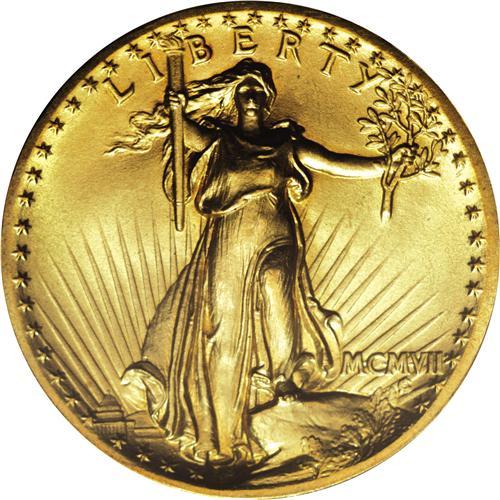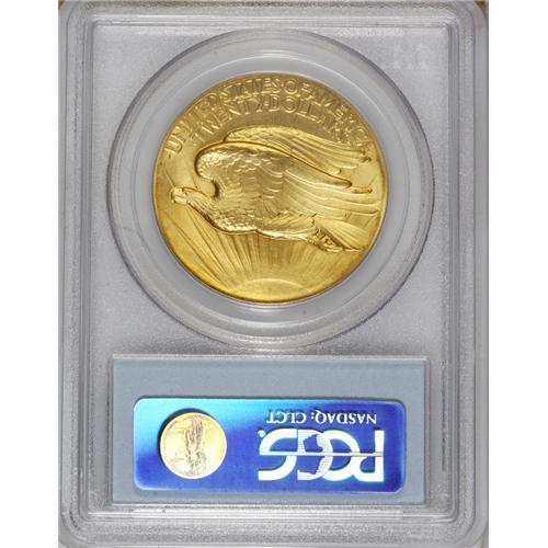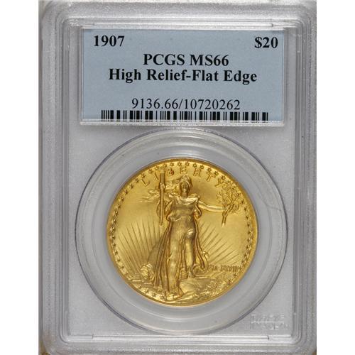 <B>1907 $20 High Relief, Flat Rim MS66 PCGS.</B></I> It seems that everyone of our auctions have multiple High Relief double eagles, and yet MS66 or finer examples are seldom offered. Our archives, active since January 1993, indicate that we have offered more than 450 High Relief double eagles in the past 15 years, yet only two dozen of those pieces equal or exceed this coin for quality. It seems that these pieces are divided equally between Wire Rim and Flat Rim coins.<BR> This particular specimen has highly lustrous yellow-gold color with subtle hints of green on each side. It is sharply struck and exhibits satiny luster. Many of the characteristics associated with those few examples certified as proofs can also be seen on this piece. Of the two major grading services, NGC will certify special pieces as proof while PCGS will not. The student of this coinage may want to examine the present example for the possibility that it is actually one of those that are considered proof or specimen strikes by NGC.<BR> For reference, we provide a summary of the criteria used by NGC when making such a determination, adapted from Dr. Robert Loewinger's reference on proof gold coinage: 1. Extremely sharp details in all areas. 2. Absence of any die distortion. 3. Random swirling die polishing lines on both sides. 4. Uniform satin surfaces without radial flowlines of business strike pieces. 5. A build-up of metal inside the borders on both sides.<BR><BR><b>Shipping:</b> Coins & Currency (<a target="_blank" href="http://www.heritageauctions.com/common/shipping.php">view shipping information</a>)