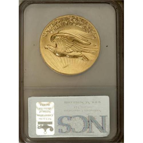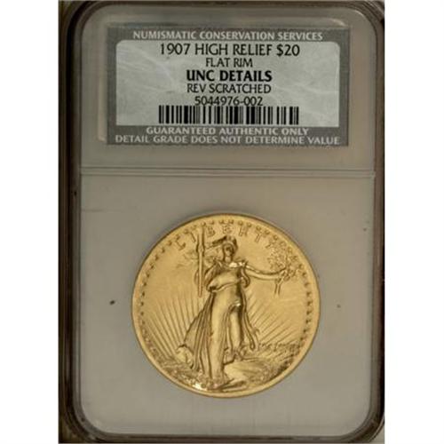 <B>1907 $20 High Relief, Flat Rim--Reverse Scratched--NCS. Unc Details.</B></I> The reverse of this piece has a small patch of pin scratches between the sun and a few rays in the lower field. Otherwise both sides are pleasing and attractive with sharp design elements and frosty yellow-gold luster.<BR><BR><B>Coin Engraver:</B> Augustus Saint-Gaudens<BR><BR><b>Shipping:</b> Coins & Currency (<a target="_blank" href="http://www.heritageauctions.com/common/shipping.php">view shipping information</a>)