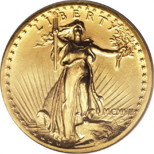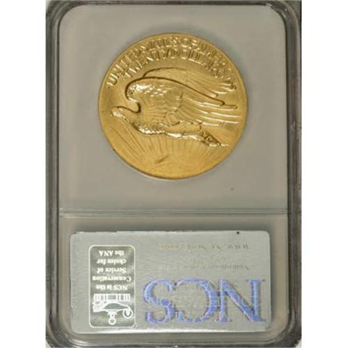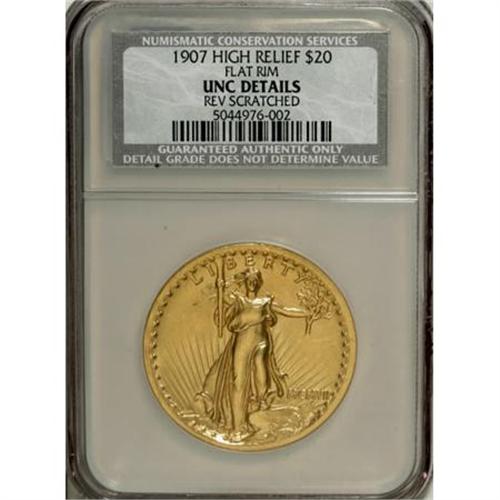 <B>1907 $20 High Relief, Flat Rim--Reverse Scratched--NCS. Unc. Details.</B></I> This satiny yellow-gold Saint-Gaudens High Relief has a small cluster of closely-spaced pinscratches above the sun, probably from an attempt to efface a now-absent spot. The obverse field has a couple of faint grazes. A splendidly struck example of this world-famous low mintage gold type.<BR><BR><B>Coin Engraver:</B> Augustus Saint-Gaudens<BR><BR><b>Shipping:</b> Coins & Currency (<a target="_blank" href="http://www.heritageauctions.com/common/shipping.php">view shipping information</a>)