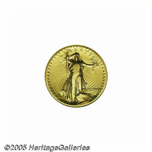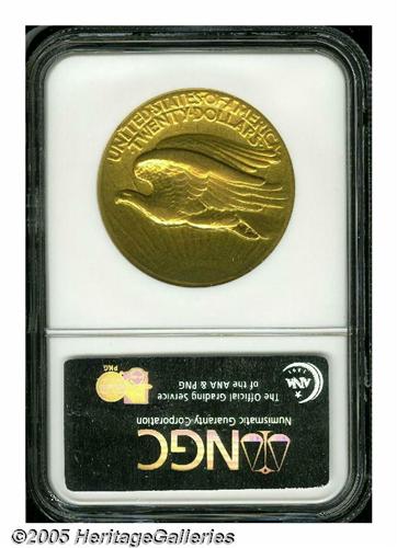 <B>1907<$20> High Relief, Flat Rim VF35 NGC.</B></I> This is a reasonably attractive example of the famous and ever-popular Saint-Gaudens High Relief Double Eagle. Heavy wear is evident overall, no doubt from being used as a pocket piece for many years. It is interesting to note NGC labeled this as a Flat Rim variety, indeed, even if this were originally a Wire Rim, it would have long since worn away! Although every worthy coin auction contains a few High Reliefs, well worn pieces have tremendous numismatic importance and are coveted by a formidable cross-section of collectors.