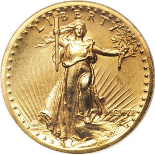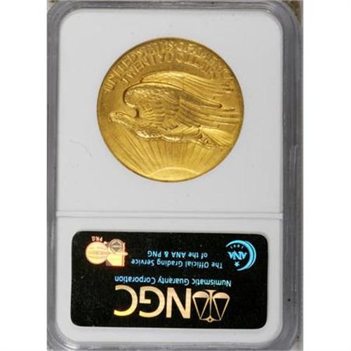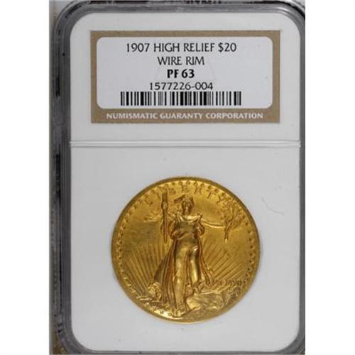 <B>1907 $20 High Relief PR63 NGC.</B></I> This Wire Rim piece, certified by NGC as a proof, has all of the required characteristics for such a determination. The strike is bold and sharp, the fields are satiny, and the die polishing lines in the obverse and reverse fields are crisp, flowing up onto the wide borders on each side. The die polishing lines are visible to some extent on al High Relief double eagles, but they are especially bold on the proofs, most prominent between the rays in the left obverse field. Both sides of this example have satiny yellow-gold luster tending toward green, with traces of additional rose toning.<BR><BR><b>Shipping:</b> Coins & Currency (<a target="_blank" href="http://www.heritageauctions.com/common/shipping.php">view shipping information</a>)