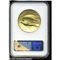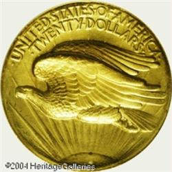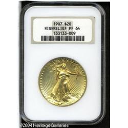 1907 $20 High-Relief PR64 NGC. After the striking <B>1907 $20 High-Relief PR64 NGC.</B></I> After the striking of the 24 Ultra High Reliefs in February and March 1907, Henry Hering (Augustus Saint-Gaudens' pupil and assistant) worked with Mint officials and prepared a second set of master dies and hubs in lower relief. Six pairs of working dies were produced that eventually struck the 11,250 coins we know today as the Wire Rim and Flat Rim High Reliefs. Two pairs of these working dies were used to also strike an unknown number of Satin Finish proofs. All High Reliefs were struck on the mint's hydraulic presses, which were normally used to produce medals. Regular business strike High Reliefs required five blows from the hydraulic press to strike up. To bring up the extra detail on proofs, the planchets were struck six or seven times. David Akers estimated that somewhere between 20 and 25 proofs were struck, but did not speculate about the number of recognizable survivors today. Subtle yet significant differences distinguish business strikes from proofs.<BR> This coin displays broad, flat borders with razor sharp inner and outer edges. In addition, the berries on the olive branch are fully rounded and all pillars in the Capitol building are separated. There are numerous swirling and horizontal striations in the fields, evidence that the dies were extensively polished before striking. The surfaces have a glowing, satin-like finish and there is a thin coating of antique-golden patina. Magnification does reveal a couple of tiny imperfections that might be used to identify this coin in the future: there is a small ding on the obverse rim at 5:30 and an almost imperceptible bruise at 5 o'clock. Also, a diagonal abrasion is seen across the eagle's tailfeathers. An exceptional opportunity to acquire this proof variant of the always-popular, High Relief Twenty. <BR><BR><B>Important notice:</B> Heritage usually auctions material at the rate of 200-250 lots per hour. On some occasions eBay Live bid software or the Internet may not be able to keep up with the pace of the auction. We recommend placing a realistic absentee bid now as insurance to avoid disappointment. Occasionally the auctioneer may eliminate or reject an eBay Live bid, and the auctioneer may also reopen a lot after the close of the eBay live bidding (usually because we missed an audience bid), and may reject your bid even if it shows you as the winning bidder. By bidding via eBay Live, you agree that Heritage may award the lot to another bidder at its sole discretion under the circumstances described above or any other reasonable circumstances. Since eBay bids are not shown to us until we open the lot on the floor, we treat those bids just like floor bids. In most cases the floor responds before the eBay bid is presented to us, due to Internet lag time, so for consistency we have made it a policy that floor bids are always considered first over tie eBay live bids. Also please note that all Heritage lots purchased through eBay Live carry a 20% Buyer's Premium. Please make sure you read the Terms and Conditions before you bid. This lot is being auctioned in conjunction with a live floor auction by Heritage Galleries & Auctioneers. All final auction and invoice information will be supplied by Heritage Galleries & Auctioneers, and all other information should be considered preliminary. Lot:7074