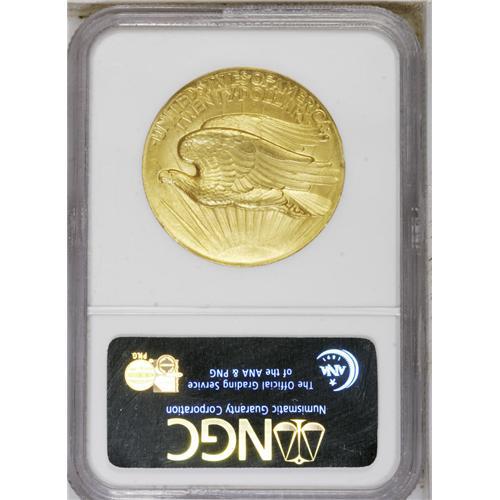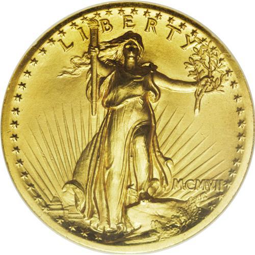 <B>1907 $20 High Relief PR66 NGC.</B></I> It is fairly well known that Augustus Saint-Gaudens, the "American Michelangelo," based his design for the double eagle on the winged goddess of Victory that forms part of the General William Tecumseh Sherman statue at the corner of Fifth Avenue and 59th Street in New York City. Sherman's horse treads on pine cones and fronds, fatefully representing Georgia, which Sherman had torched in his terrible 1864 March to the Sea. The equestrian figure of General Sherman received the Grand Prix at the 1900 Universal Exposition. The winged goddess of Victory leads Sherman's horse. She wears a headdress and strides purposefully forward, her right arm stretched out before her, giving the entire monument a rhythmic, driving propulsion. Her eyes are depthless blanks, her expression simultaneously tragic and inscrutable. Similar to the traditional olive sprig in Liberty's left hand on the coin, Victory holds a palm branch in her left hand.<BR> One of Saint-Gaudens' great gifts--one that he shared with Michelangelo--was to be able to sculpt figures on a heroic scale, and yet imbue them with personality in the most human dimensions. It is perhaps less well known that Saint-Gaudens based the statue of Victory on that of his mistress, Davida Clark. The General Sherman Monument, commissioned by the New York Chamber of Commerce in 1892, was the last monumental work of Saint-Gaudens' cancer-shortened life. The final completed monument was installed in 1903. In the evolution from winged Victory to wingless Liberty, Saint-Gaudens managed to strip the nonessential from the female figure, while maintaining both her goddesslike grandeur and heroism as well as her powerfully human femininity. Removal of the wings and headdress allowed room for the <I>de rigueur</B></I> inscription above, while focusing more attention on the center of the coin, permitting her hair to blow freely in the wind, and making room beneath for the Capitol building.<BR> This High Relief example clearly shows the diagnostics of NGC-acknowledged proofs. There is just a hint of a wire rim; the inner border is sharp; all the berries are well rounded; all the pillars of the Capitol are fully and distinctly brought up; and the tail feathers are fully distinct to the right rim. In addition, this beautiful realization of Saint-Gaudens' vision shows that ineluctable strength of definition throughout, with a purposeful strike and superb preservation that should remove any doubt as to its proof status in all but the most cynical.<BR><BR><b>Shipping:</b> Coin/Currency (<a target="_blank" href="http://www.heritageauctions.com/common/shipping.php">view shipping information</a>)
