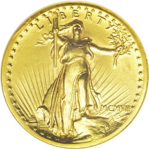 <B>1907<$20> High Relief, Wire Rim AU58 NGC.</B></I> An exceptional example for the near-Mint level, the surfaces are free of most sizeable distracting abrasions. Two parallel scratches are noted on the reverse: one over the eagle's head, the other under it to the left rim. The color is a pleasing yellow-gold shade, and the devices retain ample evidence of the powerful impression for which this first-year issue is known. An affordable alternative to a much more expensive Mint State specimen.