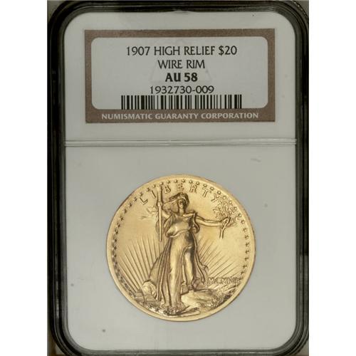 1907 $20 High Relief, Wire Rim AU58 NGC. An exceptiona