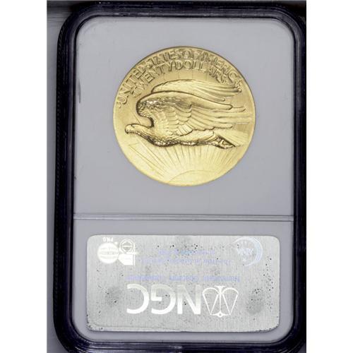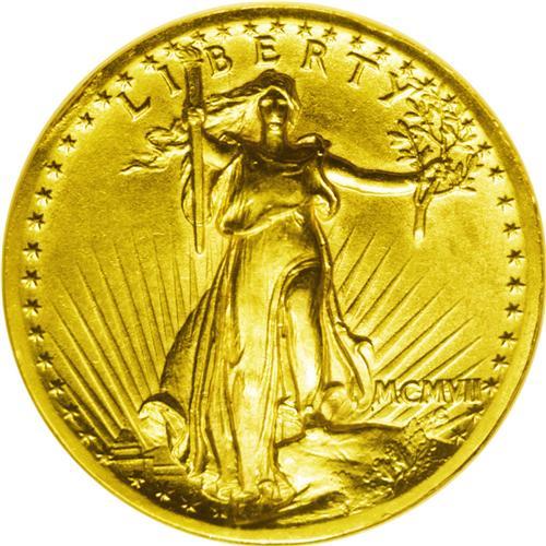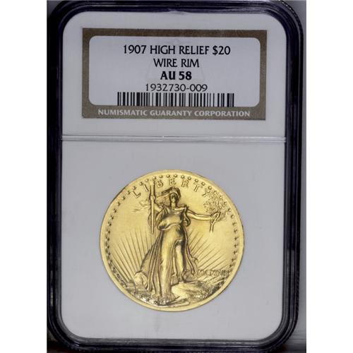 <B>1907<$20> High Relief, Wire Rim AU58 NGC.</B></I> An exceptional example for the near-Mint level. This piece boasts surfaces that are free of most sizeable distracting abrasions, save for two parallel scratches on the reverse. One is over the eagle's head; the other is under it, running to the left rim. The color is a pleasing yellow-gold shade, and the devices retain ample evidence of the powerful impression for which this first-year issue is known. Light highpoint rub is confined to Liberty's right (facing) leg and head, and the eagle's wing edge. An affordable alternative to a much more expensive Mint State specimen.