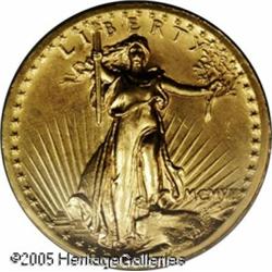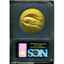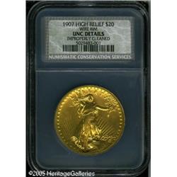 <B>1907 $20 High Relief, Wire Rim--Improperly Cleaned--NCS. Unc Details.</B></I> The first of two examples from the same consignor of this always-popular one-year type coin. The surfaces show unusual brightness from cleaning, but the striking details are exceptionally crisp on each side--the allure of this design struck in high relief still endures. Green-gold coloration with only a few tiny contact marks evident with magnification.<BR><I>Purchased from Abner Kreisberg Corporation on April 24, 1981 for $7,500.</B></I><BR><I>From The Beverly Hills Collection.</B></I> Lot:9432