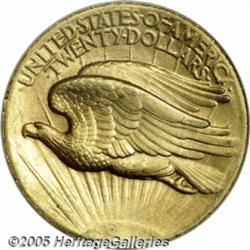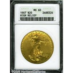 <B>1907 $20 High Relief, Wire Rim MS60 ANACS.</B></I> The Wire Rim variety was struck in December 1907, with an estimated production of 8,250 coins, out of the total High Relief mintage of 11,250 pieces. The remaining 3,000 coins were the Flat Rim variety. This is a pleasing greenish-gold example with sharp design elements and excellent eye appeal for the grade. The high wire rim is visible around nearly the entire circumference on both sides. The surfaces have a few minor scrapes and scuffs, not unusual for these coins. It is sharply struck, however, and is a highly desirable example of the original Saint-Gaudens design, before Charles Barber got his hands on this project.<BR><I>From The Luke Fay Collection.</B></I>