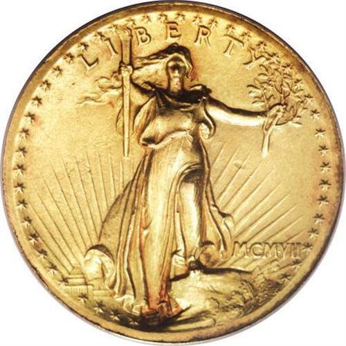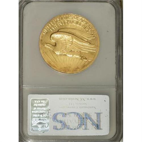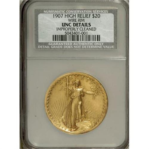 <B>1907 $20 High Relief Wire Rim--Improperly Cleaned--NCS. Unc Details</B></I> The scarce High Relief double eagles rank among the most coveted types in numismatics. On the present piece, fine hairlines are visible under magnification. Peach-gold surfaces exhibit apricot and red accents, and the strike is commanding. A small strike-through is noted on a ray southwest of the branch stem, and a wire rim encircles most of both sides. <BR><BR><b>Shipping:</b> Coins & Currency (<a target="_blank" href="http://www.heritageauctions.com/common/shipping.php">view shipping information</a>)