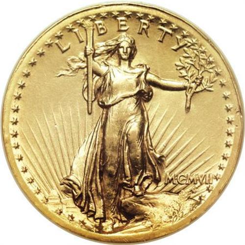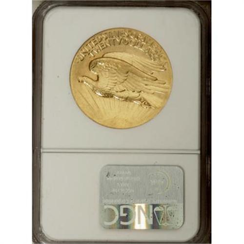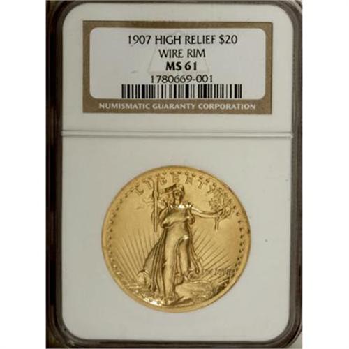 <B>1907 $20 High Relief, Wire Rim MS61 NGC.</B></I> One wonders if the excellent research conducted and written up by numismatic author Roger Burdette, culminating in the useful three-volume reference <I>Renaissance of American Coinage,</B></I> will also lead to a renaissance of interest in the various coins--High Relief Saint-Gaudens, Mercury dime, Buffalo nickel, Walking Liberty half dollar, and others--that form the subject matter for his research. One can only hope. The present High Relief shows surfaces that are suggestive of a finer grade, but a couple of paper-thin, curving scrapes are visible in the left obverse field when the coin is turned just so. Otherwise, there are few contact marks visible. Some light field haze on each side is fairly undistracting, .<BR><BR><B>Coin Engraver:</B> Augustus Saint-Gaudens<BR><BR><b>Shipping:</b> Coins & Currency (<a target="_blank" href="http://www.heritageauctions.com/common/shipping.php">view shipping information</a>)