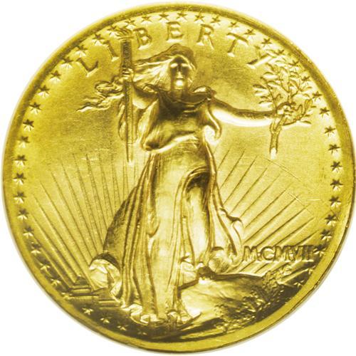 <B>1907<$20> High Relief, Wire Rim MS62 NGC.</B></I> The wire rim is pronounced and extends around approximately 50% of both the obverse and reverse of this piece. The surfaces display the usual satiny luster, and the devices are crisply defined. Traces of pink color are seen, particularly on the obverse, as the coin rotates under at light at certain angles. Kept in the MS62 category by a couple of noticeable abrasions in the right obverse field. It is always a pleasure to offer a selection of America's most beautiful coins in the same auction sale.