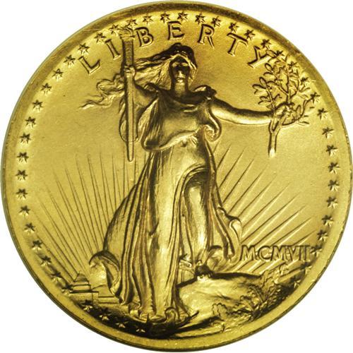 <B>1907 $20 High Relief, Wire Rim MS62 NGC.</B></I> When the High Relief twenties were finally struck in late 1907, at the insistence of President Roosevelt, a minor striking problem was encountered. Because the coins were struck multiple times on a hydraulic press a thin "fin" or "wire rim" is often seen on these pieces. This wire rim is almost complete around each side of this coin. Otherwise, the surfaces display a rich reddish-golden coloration with bright underlying satiny mint luster. A few minor contact marks account for the grade.