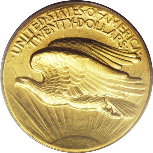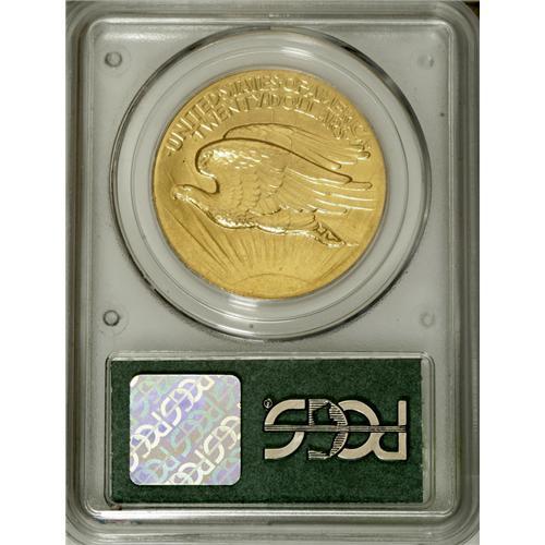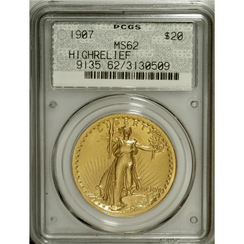 <B>1907 $20 High Relief, Wire Rim MS62 PCGS.</B></I> The Wire Rim variant is unspecified on the older green-label PCGS holder, but it is nonetheless quite visible around the rims on each side. Without discussing the merits of any potential upgrade on this particular coin--always a matter of conjecture--suffice it to say that some coin dealers and collectors specialize in buying and selling coins in the older green-label holders, some to the exclusion of all else. The present piece offers exceptionally lustrous yellow-gold surfaces with a tinge of red patina that show a couple of undistracting ticks on Liberty, and some light strike weakness on the head and left (facing) foot. The reverse also shows minor weakness at some of the letter tops, but is otherwise essentially distraction-free. This piece offers an overall pleasing appearance that is well suited to the budget-minded collector who nonetheless desires a midgrade Mint State example of this beautiful type coin.<BR><BR><b>Shipping:</b> Coins & Currency (<a target="_blank" href="http://www.heritageauctions.com/common/shipping.php">view shipping information</a>)