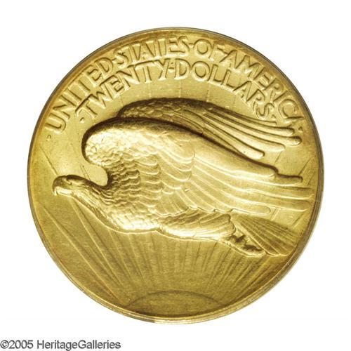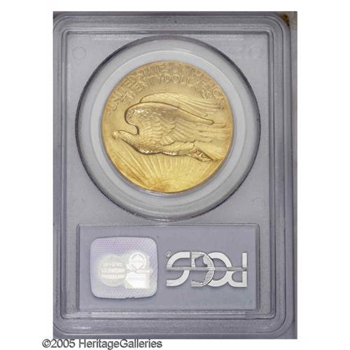 <B>1907<$20> High Relief, Wire Rim MS62 PCGS.</B></I> Thoroughly original, with bright, satiny luster and traces of orange patina about the reverse border. A moderate amount of contact in the fields keeps this attractive example from Select status. Struck in December 1907, four months after the death of its designer, noted sculptor Augustus Saint-Gaudens, the High Relief twenties were a rare example of immediate public acceptance of a newly designed coin. The artistic merit of these pieces was immediately recognized, and examples were traded at a premium among numismatists as soon as they were released.<BR><I>From The Watson Collection.</B></I>