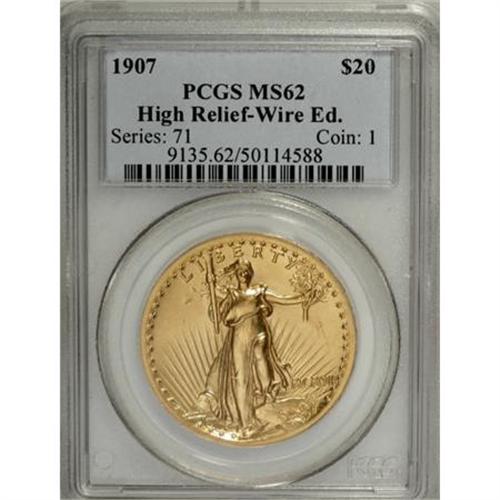 <B>1907 $20 High Relief, Wire Rim MS62 PCGS.</B></I> An impressive example of this world-famous numismatic delicacy. The radiant yellow-gold surfaces are surprisingly smooth, since marks are limited to a tick below the knee and moderate contact southeast of the olive branch. The strike is precise aside from the rays just above the sun, which are always softly brought up on this ephemeral type.<BR><BR><B>Coin Engraver:</B> Augustus Saint-Gaudens<BR><BR><b>Shipping:</b> Coins & Currency (<a target="_blank" href="http://www.heritageauctions.com/common/shipping.php">view shipping information</a>)