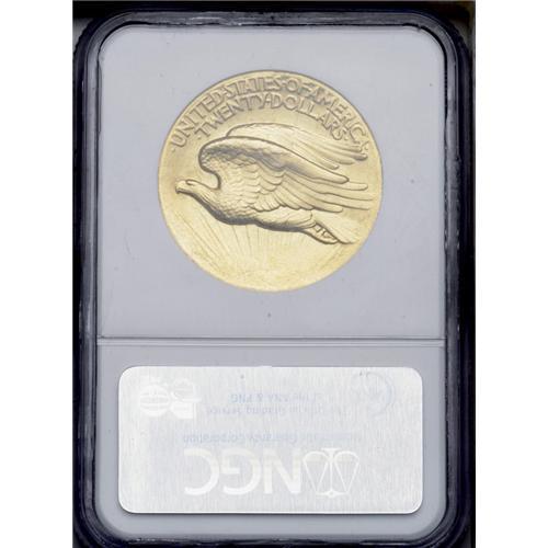 <B>1907<$20> High Relief, Wire Rim MS63 NGC.</B></I> An exceptionally well preserved High Relief that has rich, satiny mint luster with an overlay of light, even reddish patina. The striking details are finely detailed on each side, as one would expect from multiple blows from a medal press. Close examination shows a few slight marks, most noticeable on the lower reverse, but these are slight and a loupe will be required. The wire rim is almost complete around each side.<BR><I>From The Lewis (Tahoe) Collection.</B></I>