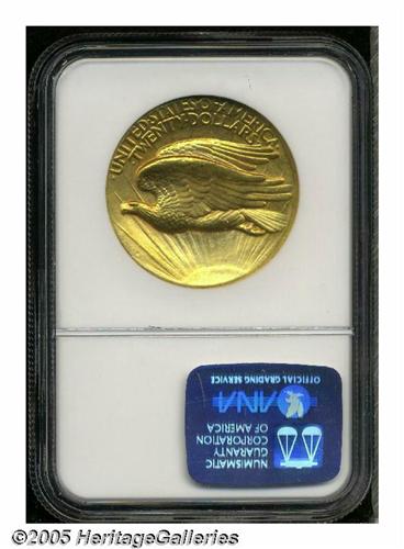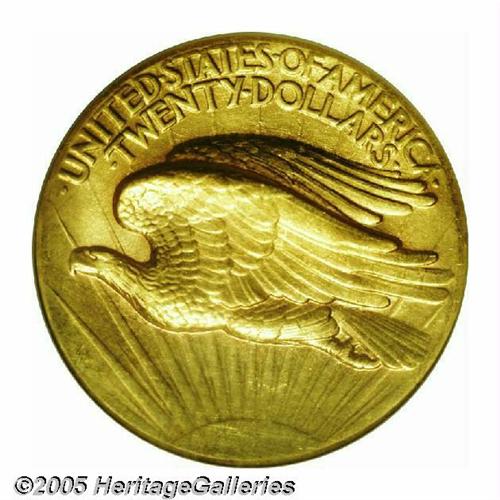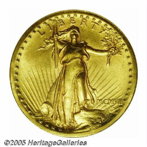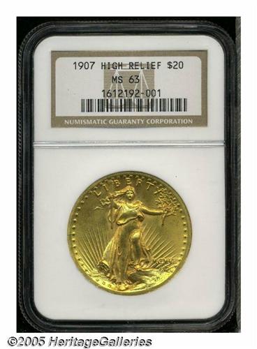 <B>1907<$20> High Relief, Wire Rim MS63 NGC.</B></I> Satiny yellow-gold surfaces reveal touches of reddish patina in the protected areas and are fairly free of abrasions. Only the obligatory stacking friction on the highpoints of Liberty's robe and along the left reverse border limit the grade. Impressive in any condition, the high relief version of Saint Gaudens' beautiful design is perhaps the single most popular 20th century gold issue.