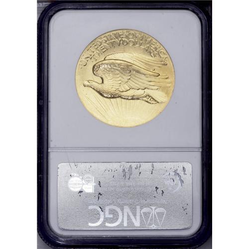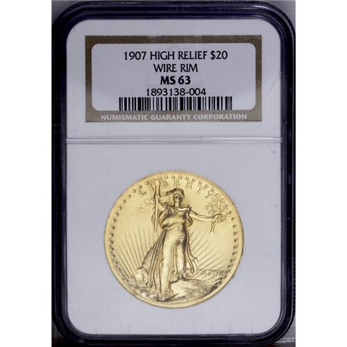 <B>1907<$20> High Relief, Wire Rim MS63 NGC.</B></I> With the exception of the multi-million dollar Ultra High Relief double eagles, the Saint-Gaudens High Relief coins are probably the most beautiful coin ever minted by the United States. These coins exist in two different varieties, with either a flat rim or a wire rim, the latter being offered here. The wire rim, or knife rim as it is sometimes called, was created as metal from the planchet was squeezed into the crevice created at the juncture of the die and the collar. The resultant thin flange of gold was easily susceptible to tiny bruises in later years, and is rarely encountered in pristine condition today, even on the highest grade pieces. This example is sharply struck and has brilliant yellow-gold surfaces. Minor abrasions are visible on both sides and these limit the grade. The present example is a highly attractive and pleasing specimen.