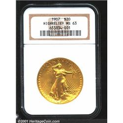 1907 $20 High Relief, Wire Rim MS63 NGC.<p>This is a nice coin for the grade with a warmly colored, honey-gold sheen. The fully defined and bold devices are typically impressive for the issue, and the surfaces are free of all but a few wispy luster grazes in the obverse field. Important notice: We expect to be auctioning lots at the rate of 200-250 per hour. Sometimes eBay Premier live bid software cannot keep up with that pace, so we strongly recommend that you place a realistic proxy bid now as insurance to avoid disappointment. Also please note that all Heritage/CAA lots purchased through eBay Premier carry a 20% Buyer's Premium.