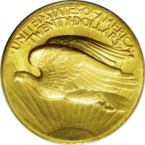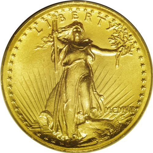 <B>1907<$20> High Relief, Wire Rim MS63 PCGS.</B></I> The satiny yellow-gold surfaces reveal touches of greenish patina in the fields that are fairly free of abrasions. Only some stacking friction on Liberty's knee and a few marks in the right obverse field limit the grade. Although the PCGS holder reduces the visual range, the wire rim appears to extend around the circumference of most of each side. Impressive in any condition, the high relief version of Saint Gaudens' beautiful design is perhaps the single most popular 20th century gold issue.