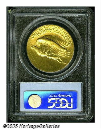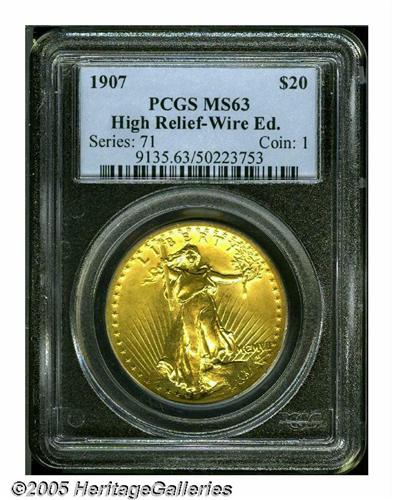 <B>1907<$20> High Relief, Wire Rim MS63 PCGS.</B></I> This lovely coin has the look of an even higher grade. We can find no bothersome abrasions and the surfaces display the smooth, satiny texture that characterizes many examples of this issue. With boldly struck features and awe-inspiring definition, this coin would catch the eye of even the most casual observer.
