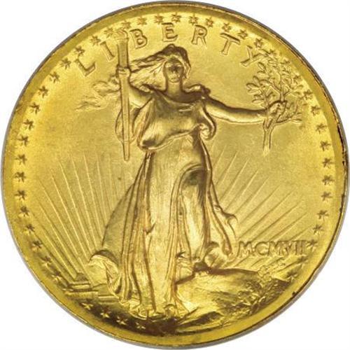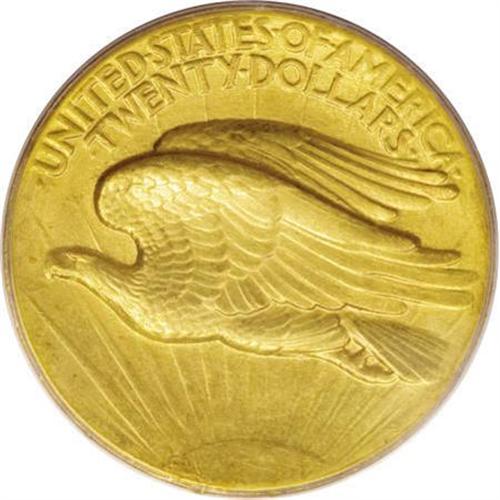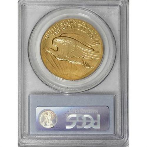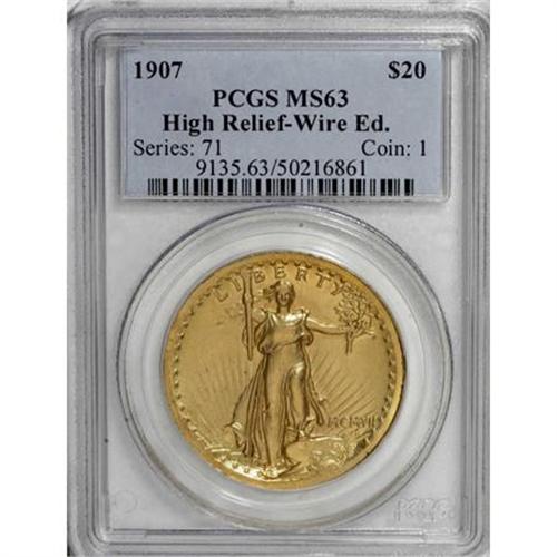 <B>1907 $20 High Relief, Wire Rim MS63 PCGS.</B></I> When viewing a High Relief, it is obvious that the design was produced by a sculptor. It is radically different in concept from all that preceded it, which were coins that were designed by mint personnel. The only previous design that approaches Saint-Gaudens' concept was the radically different depiction of a modified Britannia on the Gobrecht dollar, which was based on sketches by noted artists Titian Peale and Thomas Sully. <BR> The three-dimensional quality of the High Relief is a compelling feature on this coin. On this particular piece, the fullness of strike gives the figure of Liberty and the eagle a directness not seen on any other American coin. The satiny surfaces have a rich yellow-gold color with a slight tinge of reddish patina. Minimally abraded for an MS63.<BR><BR><B>Coin Engraver:</B> Augustus Saint-Gaudens<BR><BR><b>Shipping:</b> Coins & Currency (<a target="_blank" href="http://www.heritageauctions.com/common/shipping.php">view shipping information</a>)