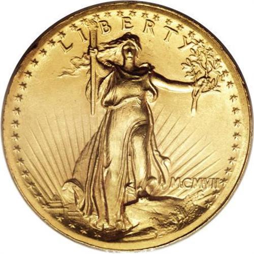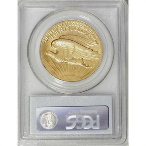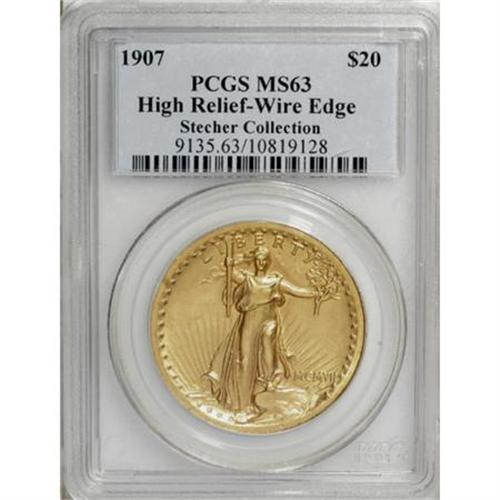 <B>1907 $20 High Relief, Wire Rim MS63 PCGS.</B></I> Ex: Stecher Collection. A lovely green-gold representative of this American gold classic. The obverse has a prominent wire rim that rises a couple of millimeters above the surface between 2 and 4 o'clock. The wire rim is also unbroken on the reverse, although it lacks the height seen on the right obverse. Satin luster gently sweeps the unperturbed fields. The devices rise in medal-like relief, with splendid definition on Liberty's fingers, nose, and raised knee. The eagle also has bold highpoint detail on the eagle's breast and the crest of the front wing. The possession of a high relief twenty separates a major collection from the usual date and mintmark assemblage.<BR><BR><B>Coin Engraver:</B> Augustus Saint-Gaudens<BR><BR><b>Shipping:</b> Coins & Currency (<a target="_blank" href="http://www.heritageauctions.com/common/shipping.php">view shipping information</a>)
