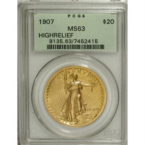 <B>1907 $20 High Relief, Wire Rim MS63 PCGS.</B></I> A lovely and original pumpkin-gold representative of this American numismatic classic. The satiny fields are refreshingly smooth, and in fact there are fewer marks than on the typical MS65-graded 1924 double eagle. The strike is precise, even on the high points such as Liberty's raised knee and the upper edge of the eagle's front wing. Although higher-graded examples are always available on the market, the present piece is a wonderful compromise between quality and affordability. Certified in a green label holder.<BR><BR><B>Coin Engraver:</B> Augustus Saint-Gaudens<BR><BR><b>Shipping:</b> Coins & Currency (<a target="_blank" href="http://www.heritageauctions.com/common/shipping.php">view shipping information</a>)