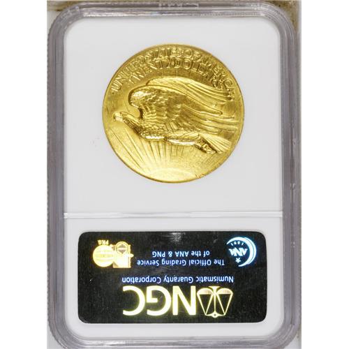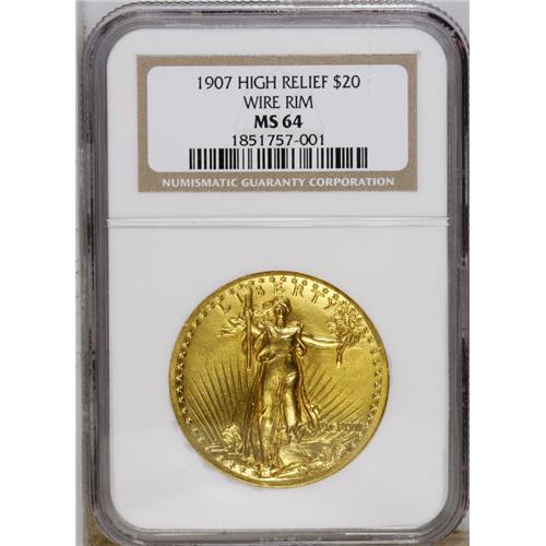 <B>1907 $20 High Relief, Wire Rim MS64 NGC.</B></I> David Akers, writing in 1982, once said: "The 1907 High Relief Double Eagle is, in my opinion, the most beautiful coin ever issued for normal circulation. Unfortunately, it was not as practical as it was beautiful; the high relief of the standing figure of Liberty and the eagle made the coin impossible to stack properly and thus unpopular and unsuitable for commercial purposes. Minting was also impractical since it reportedly required five blows of the minting press to fully bring up the design making high speed, mass production impossible."<BR> This near-Gem is well struck with pleasing, satiny luster. There are a few shallow marks, mostly located on the lower reverse, that account for the grade of the coin. An attractive example overall with good eye appeal.<BR><BR><b>Shipping:</b> Coin/Currency (<a target="_blank" href="http://www.heritageauctions.com/common/shipping.php">view shipping information</a>)