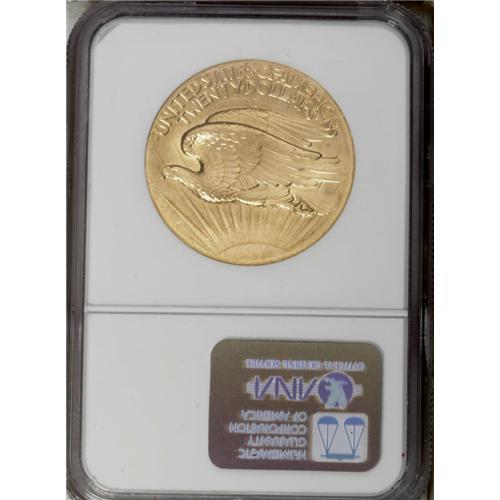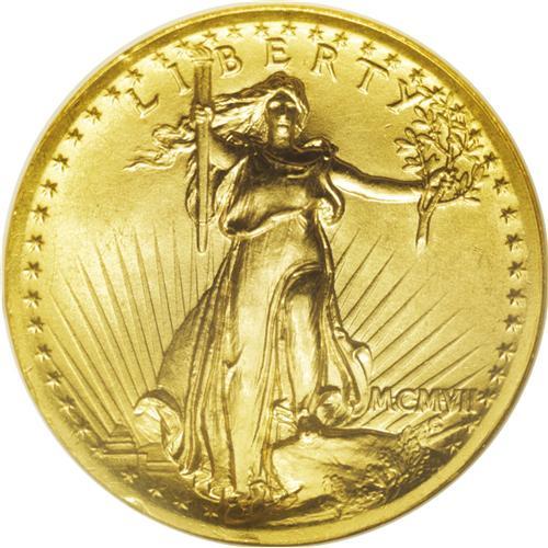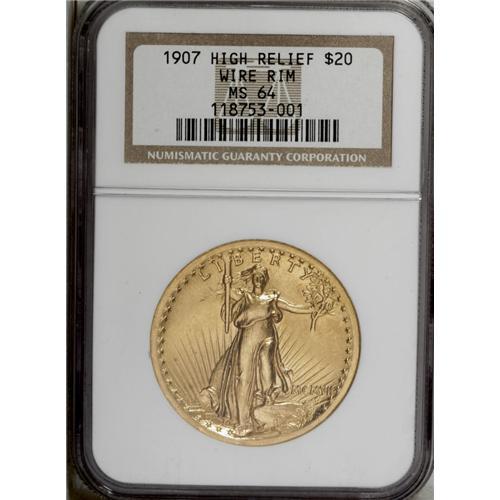 <B>1907 $20 High Relief, Wire Rim MS64 NGC.</B></I> Many observers have called the Saint-Gaudens double eagle design the most beautiful in American numismatics, and noted gold coinage expert David Akers has referred to the High Relief coins of 1907 as the most beautiful pieces ever produced for normal circulation. This example is well struck with fine grain surface textures and a pleasing satiny sheen. The green-gold coloration shows lovely accents of rose in the obverse fields. Rim nicks located near 7 o'clock and 8 o'clock, respectively, on the obverse, may have been a consideration in the grade assessment, as any other surface flaws seem negligible, although a couple of trivial nicks are acknowledged on Liberty's lower right (facing) leg and lower abdomen, respectively. A gorgeous, high-end representative of this ever-popular issue, well known to even the most casual numismatist.<BR><BR><b>Shipping:</b> Coin/Currency (<a target="_blank" href="http://www.heritageauctions.com/common/shipping.php">view shipping information</a>)