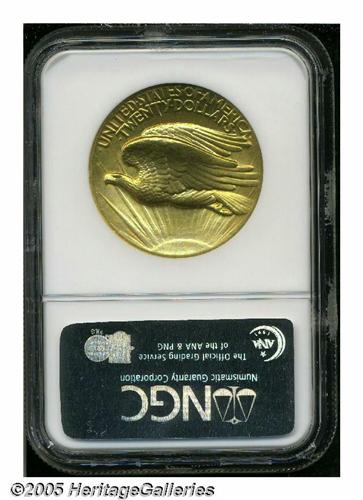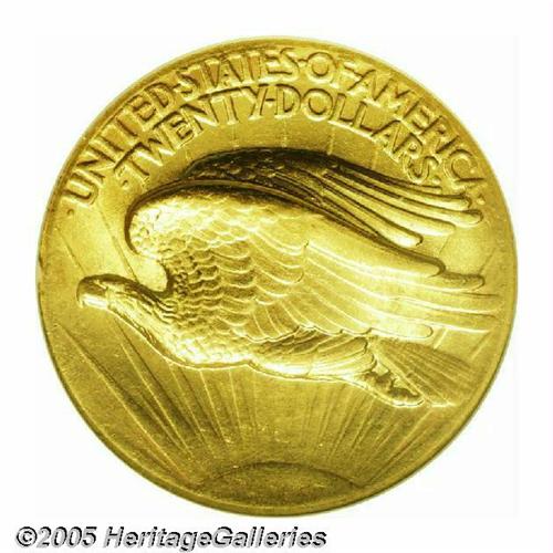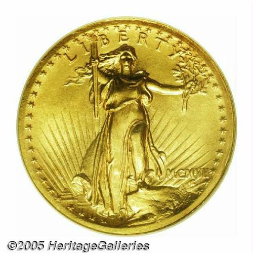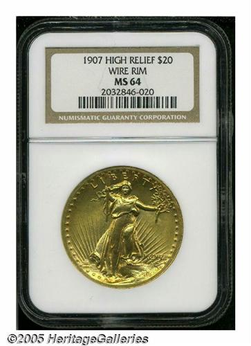 <B>1907<$20> High Relief, Wire Rim MS64 NGC.</B></I> The production of the Saint-Gaudens' designed double eagles was termed President Roosevelt's "pet baby" in correspondence between himself and the artist. Production of this coin is also an example of how one man's will can move mountains. Roosevelt was single-minded in the matter of the production of this coin. He thought Charles Barber's circulating coinage was of "atrocious hideousness." Strong stuff for those who collect these coins today, but Roosevelt was comparing these pieces to the coinage of ancient Greece and Macedon. He had to put up with numerous delays from Saint-Gaudens, who had other commissions and was suffering from stomach cancer, on the one hand, and Charles Barber, who resented any outside interference in Mint matters, on the other hand. This is a particularly attractive coin that has bright, exceptionally vibrant, lustrous surfaces. There is a noticeable accent of reddish patina on each side, and only the tiniest contact marks are present (visible only with a loupe).<BR><I>From the Dr. Kurt Peters Collection.</B></I> From the Dr. Kurt Peters Collection.