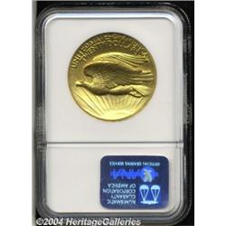 <B>1907<$20> High Relief, Wire Rim MS64 NGC.</B></I> The term "upper-end" is used frequently in numismatics, some would say overused, but few would quarrel with calling this coin upper-end for the grade. The surfaces have rich golden-orange coloration and the swirling die polish marks in the fields impart a brightness to the satiny mint luster that is most attractive. The only blemishes of any note are a short, shallow, angling mark below the olive branch on the obverse, and on the upper reverse there is evidence of some sort of strike-through over STAT(ES OF AM)ERICA--a very unusual occurrence on a High Relief and the first such error we can recall having seen. Crisp striking definition is seen on all the devices as well. <BR><BR><B>Important notice:</B> Heritage usually auctions material at the rate of 200-250 lots per hour. On some occasions eBay Live bid software or the Internet may not be able to keep up with the pace of the auction. We recommend placing a realistic absentee bid now as insurance to avoid disappointment. Occasionally the auctioneer may eliminate or reject an eBay Live bid, and the auctioneer may also reopen a lot after the close of the eBay live bidding (usually because we missed an audience bid), and may reject your bid even if it shows you as the winning bidder. By bidding via eBay Live, you agree that Heritage may award the lot to another bidder at its sole discretion under the circumstances described above or any other reasonable circumstances. Since eBay bids are not shown to us until we open the lot on the floor, we treat those bids just like floor bids. In most cases the floor responds before the eBay bid is presented to us, due to Internet lag time, so for consistency we have made it a policy that floor bids are always considered first over tie eBay live bids. Also please note that all Heritage lots purchased through eBay Live carry a 20% Buyer's Premium. Please make sure you read the Terms and Conditions before you bid.