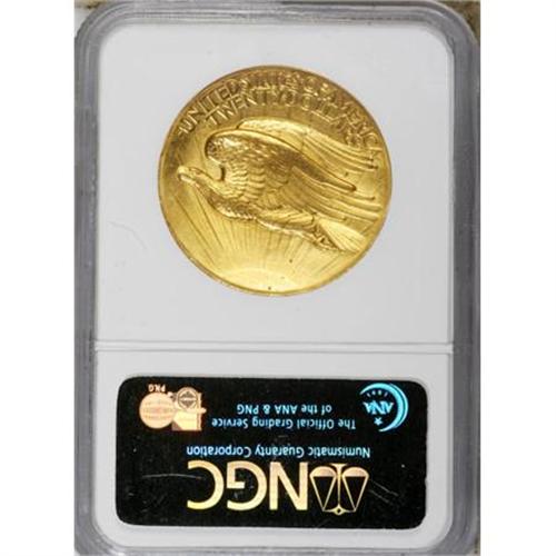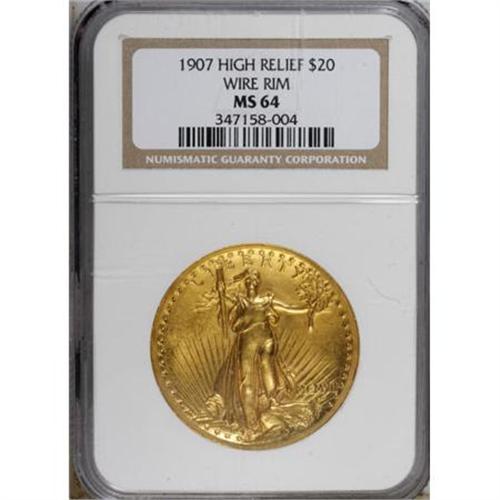 <B>1907 $20 High Relief, Wire Rim MS64 NGC.</B></I> A piece that approaches Gem status in the quality of its surfaces as well as in the excellence of its eye appeal, the present example boasts lovely yellow-gold surfaces. Bright flashy luster radiates from each side of the coin, a type that never fails to stun and delight viewers with its sculptural details and timeless elegance. Close scrutiny with a loupe reveals a dearth of mentionable abrasions, save for a couple of small contact marks that are well hidden in the eagle's feathers, and a small tick on Liberty's face. A couple of tiny alloy spots are seen on the reverse. A pretty piece that merits inclusion in a fine collection.<BR><BR><b>Shipping:</b> Coins & Currency (<a target="_blank" href="http://www.heritageauctions.com/common/shipping.php">view shipping information</a>)