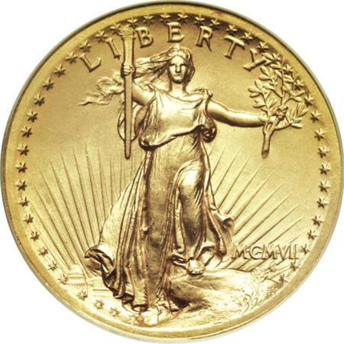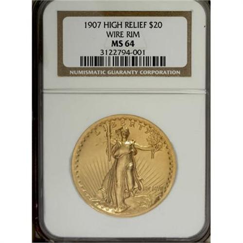<B>1907 $20 High Relief, Wire Rim MS64 NGC.</B></I> Like many others, Garrett and Guth lauded the High Relief double eagles in their <I>Encyclopedia of U.S. Gold Coins</B></I>. For the Wire Rim pieces, they began: "Aside from the handful of coins that show the Ultra High Relief, these represent the closest obtainable coin to Augustus Saint-Gaudens's conception of the design. None other than Teddy Roosevelt demanded a change in our national coinage, and sought out one of the most talented artists of the era ... "<BR> The rest is familiar history, as exemplified by this attractive near-Gem. The butter-yellow fields are luminous and slightly hazy, and the figures of Liberty and the eagle project boldly. Pleasingly preserved and undeniably attractive, an excellent example for the double eagle enthusiast.<BR><BR><B>Coin Engraver:</B> Augustus Saint-Gaudens<BR><BR><b>Shipping:</b> Coins & Currency (<a target="_blank" href="http://www.heritageauctions.com/common/shipping.php">view shipping information</a>)