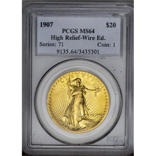 <B>1907<$20> High Relief, Wire Rim MS64 PCGS.</B></I> Bright yellow-gold and highly lustrous in the fields. The strike is bold indeed, a quality expected for these superbly executed coins. The surfaces are Choice, with minimal signs of handling present. A loupe will find a tiny horizontal nick on the I of LIBERTY and a couple of others on the torch, and these are noted for identification purposes. The Wire Rim variant of the High Relief is much more plentiful than the Flat Rim, although for many years they were thought to exist in approximately equal numbers.<BR> Although much has been written about the design and execution challenges overcome to bring these magnificent coins to fruition, no other coin struck for circulation really comes close to this masterpiece. In Choice grades as offered here, the stunning design elements are both well preserved and obtainable for a collector who can afford the going market price. <BR><BR><B>Important notice:</B> Heritage usually auctions material at the rate of 200-250 lots per hour. On some occasions eBay Live bid software or the Internet may not be able to keep up with the pace of the auction. We recommend placing a realistic absentee bid now as insurance to avoid disappointment. Occasionally the auctioneer may eliminate or reject an eBay Live bid, and the auctioneer may also reopen a lot after the close of the eBay live bidding (usually because we missed an audience bid), and may reject your bid even if it shows you as the winning bidder. By bidding via eBay Live, you agree that Heritage may award the lot to another bidder at its sole discretion under the circumstances described above or any other reasonable circumstances. Since eBay bids are not shown to us until we open the lot on the floor, we treat those bids just like floor bids. In most cases the floor responds before the eBay bid is presented to us, due to Internet lag time, so for consistency we have made it a policy that floor bids are always considered first over tie eBay live bids. Also please note that all Heritage lots purchased through eBay Live carry a 20% Buyer's Premium. Please make sure you read the Terms and Conditions before you bid. This lot is being auctioned in conjunction with a live floor auction by Heritage Galleries & Auctioneers. All final auction and invoice information will be supplied by Heritage Galleries & Auctioneers, and all other information should be considered preliminary. Lot:4505 <BR><BR><B>Winning Notification and Billing:</B> After the FINAL session in this auction is complete, Heritage will send e-mail and snail mail invoices. This process normally takes several days. All final auction and invoice information will be supplied by Heritage Galleries & Auctioneers, and all other information should be considered preliminary. <BR><BR>This auction will be conducted on a live auction floor and over the Internet through eBay Live. If you choose to place an absentee bid, please take a moment to <font color='#0000ff'><u><a href='http://pages.ebay.com/liveauctions/help/before/laabsentee.html'>learn how eBay Live absentee bidding works</a></u></font><font color='#000000'>
