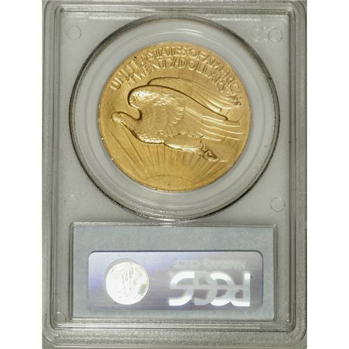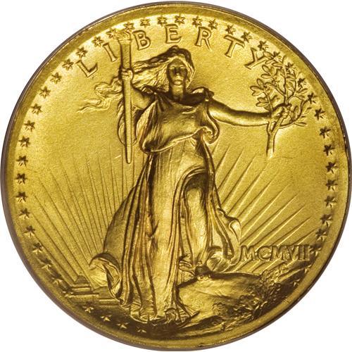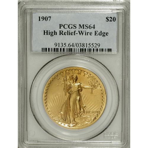 <B>1907 $20 High Relief, Wire Rim MS64 PCGS.</B></I> The year 2007 is the 100th anniversary of the premiere of the various Saint-Gaudens designs, and as such it might be an opportune time for some forthright bidder to nab this lovely near-Gem example of the High Relief issue. After all, the High Relief is the most affordable compromise between Saint-Gaudens' original artistic vision and the subsequent realities of "modern" coinage production. The wire rim on the present example is visible on the obverse from 8 o'clock moving clockwise to 4 o'clock, and on all of the reverse. Were it not for a couple of stray marks on Liberty's breast and torso, this piece might have merited a Gem grade, as it certainly has the eye appeal elsewhere. The fields are smooth and unperturbed, the strike is bold (of course), and the color is a beautiful yellow-gold with just a tinge of beige. A lot of coin for the grade.<BR><BR><b>Shipping:</b> Coins & Currency (<a target="_blank" href="http://www.heritageauctions.com/common/shipping.php">view shipping information</a>)