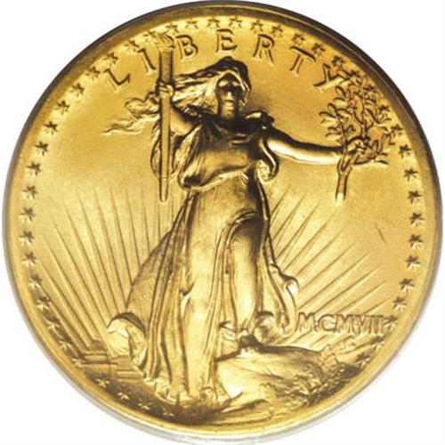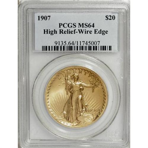 <B>1907 $20 High Relief, Wire Rim MS64 PCGS.</B></I> While Roger Burdette acknowledges the beauty of the Saint-Gaudens double eagle design, in his <I>Renaissance of American Coinage 1905-1908</B></I>, he also criticizes Saint-Gaudens and Roosevelt for not doing more to make the models suitable for day-to-day production (2006): "By continuing with the design in a relief that was not coinable, Saint-Gaudens lost his best chance to explore the limits of artistry on circulation coinage. By the close of 1907 the result was Charles Barber's re-engraving of the Saint's design, rather than Saint-Gaudens producing the highest art within the practical limits of coinage."<BR> Practical or not, the High Relief double eagles are works of art, and the near-Gem offered here is an appealing representative. The boldly impressed devices and satiny sun-gold surfaces are carefully preserved, and the overall visual appeal is amazing. A delightful piece that is sure to please the victorious bidder.<I><BR>From The Carlton Woods Collection.</B></I><BR><BR><B>Coin Engraver:</B> Augustus Saint-Gaudens<BR><BR><b>Shipping:</b> Coins & Currency (<a target="_blank" href="http://www.heritageauctions.com/common/shipping.php">view shipping information</a>)