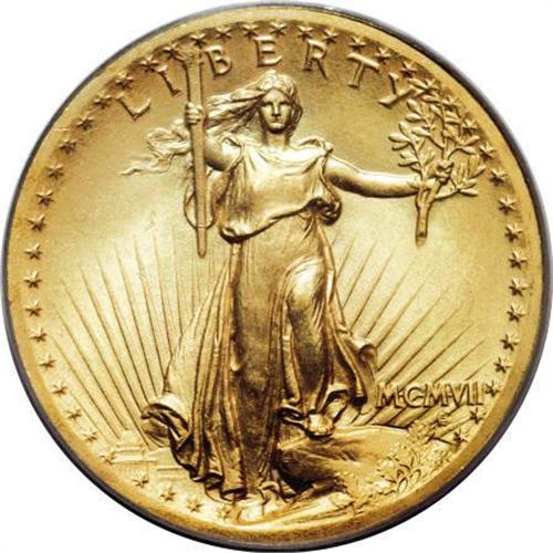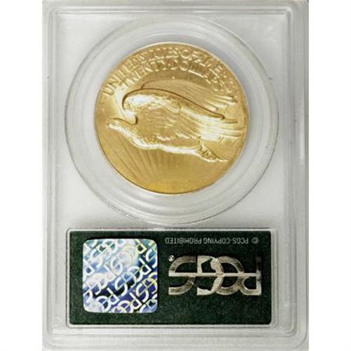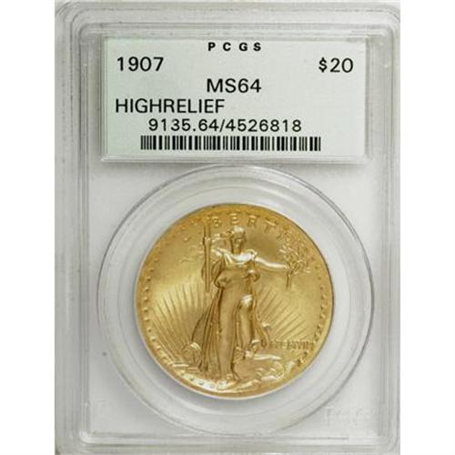 <B>1907 $20 High Relief, Wire Rim MS64 PCGS.</B></I> Though not explicitly labeled as such on the holder, this High Relief example shows a distinct wire rim at the right obverse and reverse. A touch of haze has settled over the butter-yellow fields, lending them hints of apricot and pink. Decisively struck and pleasingly preserved overall, this near-Gem offers the masterful, sculptural quality that has attracted the attention of numismatists and critics alike for over a century.<BR> The Cornish, New Hampshire residence and grounds of Aspet, the estate of Augustus Saint-Gaudens, are now part of the National Historic Site that bears his name. The Site showcases dozens of his works, and emphasis is placed on his role in the redesign of American coinage.<BR><BR><B>Coin Engraver:</B> Augustus Saint-Gaudens<BR><BR><b>Shipping:</b> Coins & Currency (<a target="_blank" href="http://www.heritageauctions.com/common/shipping.php">view shipping information</a>)