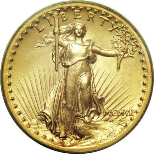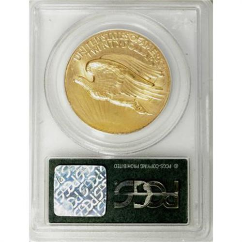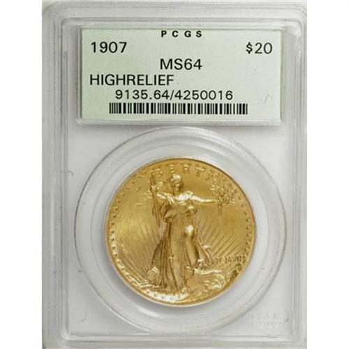 <B>1907 $20 High Relief, Wire Rim MS64 PCGS.</B></I> This Choice Mint State double eagle is a sharply struck piece with soft, frosty luster and pleasing orange-yellow color. A wire rim is noted along the upper obverse from approximately 10 o'clock to 3 o'clock, and along the lower reverse from around 3 o'clock to 10 o'clock. A pair of faint, yet grade-limiting pinscratches are visible in the left obverse field. Otherwise, the surfaces on both sides are exceptional. Traces of die polish can be seen, mostly on the reverse near the border. Saint-Gaudens' design, in this High Relief format, is considered by many to be the most beautiful coin design ever produced. Housed in an older green label PCGS holder.<BR><I>From The Jacob Collection of Saint-Gaudens Double Eagles.</B></I><BR><BR><B>Coin Engraver:</B> Augustus Saint-Gaudens<BR><BR><b>Shipping:</b> Coins & Currency (<a target="_blank" href="http://www.heritageauctions.com/common/shipping.php">view shipping information</a>)