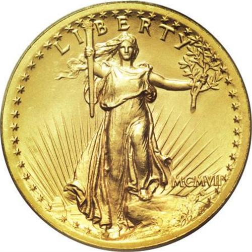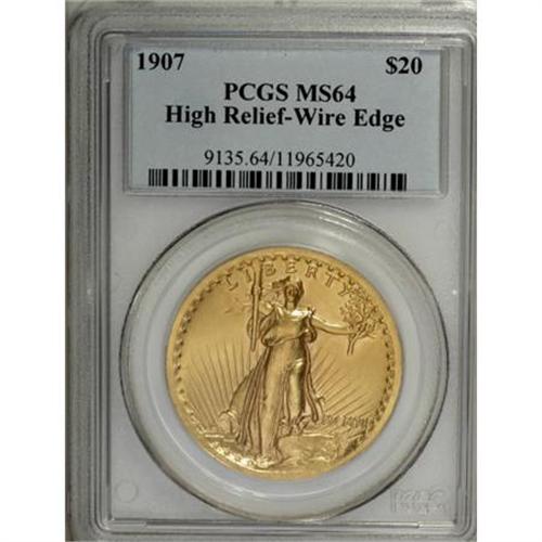 <B>1907 $20 High Relief, Wire Rim MS64 PCGS.</B></I> Despite the modest grade of MS64, this splendid High Relief is an amazing coin that will easily be appreciated, even by the most advanced specialist. It has rich light yellow surfaces and satiny luster on both sides. There are a few inconsequential marks, but no blemishes of any concern. The borders are complete with a full knife edge or fin, as it was called in the Mint. Although it is difficult to call the MCMVII High Relief double eagle a rare coin, despite a low mintage of only 11,250 coins, the demand for these pieces is incredibly high.<BR><BR><B>Coin Engraver:</B> Augustus Saint-Gaudens<BR><BR><b>Shipping:</b> Coins & Currency (<a target="_blank" href="http://www.heritageauctions.com/common/shipping.php">view shipping information</a>)