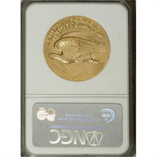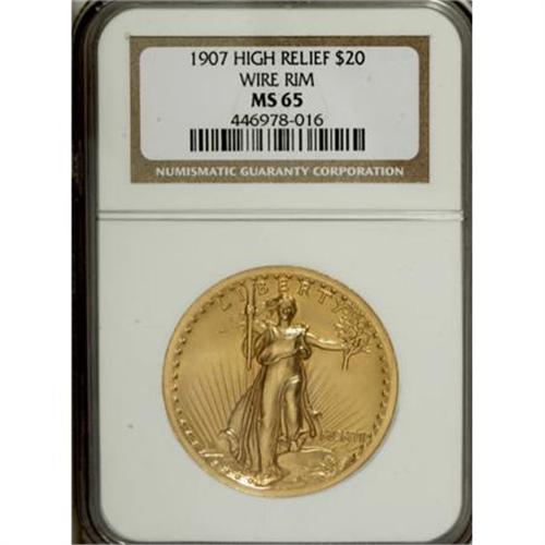 <B>1907 $20 High Relief, Wire Rim MS65 NGC.</B></I> Augustus Saint-Gaudens built his artistic reputation on grand-scale public and private works. In his lifetime, he sculpted subjects from goddesses to generals, all to ever-increasing acclaim. Art collectors still acknowledge his genius a century after his death, and they continue to pay sizable sums for his smaller works. In 2005, a 41-inch-high version of <I>Diana of the Tower</B></I> sold at auction for nearly half a million dollars; the original, an 18-foot-high rendition of the mythological huntress, was meant for the tower atop Madison Square Gardens.<BR> Saint-Gaudens did not live to see one of his last projects, the design for the double eagle, come to fruition. Yet that unfinished work is the source of his most enduring legacy. Despite his death on August 3, 1907, progress continued on the models. As Saint-Gaudens succumbed to cancer, he relied more and more on his capable assistant, Henry Hering. Hering was a vital contributor to the project and was an adept liaison between the visionary Saint-Gaudens and the technically minded Mint engravers. In his <I>A Guide Book of Double Eagle Gold Coins</B></I>, Q. David Bowers (2004) quotes a May 11, 1907 letter from Saint-Gaudens to Theodore Roosevelt, in which Saint-Gaudens praised Hering and stated that his assistant knew more about "the mechanical requirements of the coin." Hering finished many of the remaining details on his teacher's models and defended the interests of Saint-Gaudens and his widow in the face of months of hostility from Mint engravers.<BR> Saint-Gaudens is one of the best-known artists ever to design a coin, and the High Relief double eagles are the source of his greatest fame. The Gem offered here is a wonderful exemplar. Crisp devices, the result of multiple blows from the press, project from shining yellow-orange fields. Both sides feature an extensive wire rim. The surfaces are well-preserved; with no flaws discernible to the naked eye. An incredibly appealing representative of this highly sculptural and widely praised design.<BR><BR><B>Coin Engraver:</B> Augustus Saint-Gaudens<BR><BR><b>Shipping:</b> Coins & Currency (<a target="_blank" href="http://www.heritageauctions.com/common/shipping.php">view shipping information</a>)