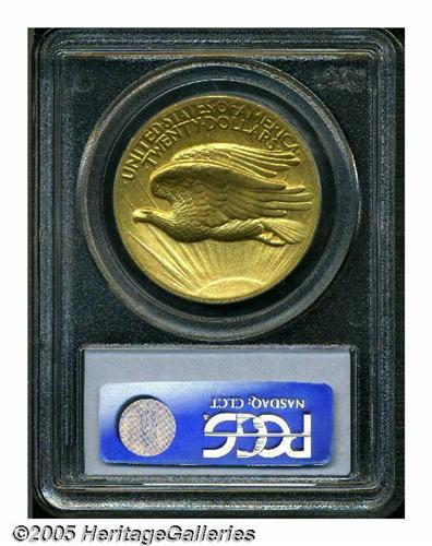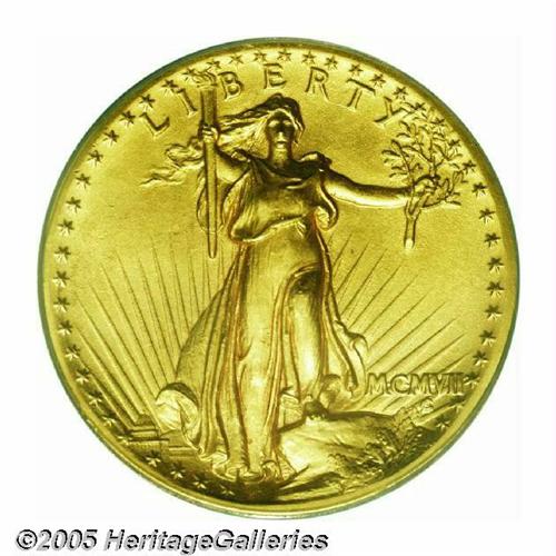 <B>1907<$20> High Relief, Wire Rim MS65 PCGS.</B></I> The High Relief double eagle is one of the most popular and unquestionably beautiful coins ever produced by the U.S. mint. It was the culmination of a process that began in 1905 at a White House dinner with President Theodore Roosevelt and noted sculptor Augustus Saint-Gaudens. Both men admired the artistic accomplishments of the Greek coins struck around the time of Alexander the Great and the high relief these pieces were struck in. Both assumed since the Greeks could produce such coins with artistic merit 2,200 ago, surely the United States Mint could also. What both men failed to recognize, however, was the ancient Greeks were not in a hurry to mass produce their coinage. The United States Mint was in a hurry, and had deadlines to meet for each series produced in each mint. This was something Charles Barber knew. Barber had artistic differences with Saint-Gaudens going back to 1892, but that aside, he knew that the models Henry Hering delivered to the Mint in 1907 were impossible to produce with a single strike from a steam press. Tests were conducted and a singly struck coin could not be fully brought up--it lacked complete details and was especially lacking in the area of the torch on the obverse. Seven blows from a hydraulic press for medals (not the normal coining press for coins), were required to fully bring up all the details Saint-Gaudens engraved in the models he sent to the Mint. The High Relief twenties, such as the one seen in this lot, are a compromise on the part of Augustus Saint-Gaudens and Henry Hering. Their original concept was the Ultra High Relief for circulating coinage--a splendid idea but one that was completely impractical from the standpoint of mass production. After 11,000 or so strikings of the High Relief (as seen here) the project was abandoned, the original design lowered to practical levels, and large production commenced with the Arabic Numerals 1907 issue. The High Relief twenties remain, however, a testament to what could have been if time and money were no object in the production of coinage. This particular piece has finely granular surfaces with an overlay of satiny mint luster. The green-gold surfaces display just a bit of reddish patina, and there are no reportable contact marks on either side.