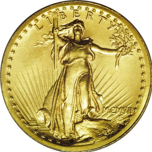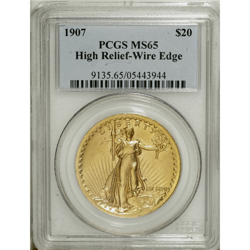 <B>1907 $20 High Relief, Wire Rim MS65 PCGS.</B></I> Volumes have been written about High Relief Double Eagles; perhaps the finest available embodiment of the vision of Augustus Saint-Gaudens for anyone not well-heeled enough to be able to acquire the Ultra High Relief piece such as the one also featured in this auction. When on display, this exquisite design stands out, quite literally, from the rest of the pack, and its reputation as a numismatic masterpiece is such that perhaps every serious collector of U.S coinage wants one. Heritage has the privilege of featuring several of these exquisite twenties in virtually all of our Signature Auctions, and recent results tell us that this piece's popularity shows no signs of abating.<BR> This piece is an example of the Wire Rim variant, so-called because of the narrow ridge of metal that protrudes from the outer edges of the coin. Walter Breen referred to this as a Knife Rim, but whatever the nomenclature, it was unpopular with Mint officials in 1907 for practical reasons, and manufacturing methods were changed to minimize the feature, with some success. This particular coin shows its wire rim most prominently between 12 o'clock and 7 o'clock on the obverse. It is a brilliant, peach-gold Gem, blessed with a nearly uniform metallic sheen over its surfaces. Surface abrasions are few and unobtrusive, and detract neither from the coin's eye appeal nor from the magnificence of the design.<BR><BR><b>Shipping:</b> Coin/Currency (<a target="_blank" href="http://www.heritageauctions.com/common/shipping.php">view shipping information</a>)