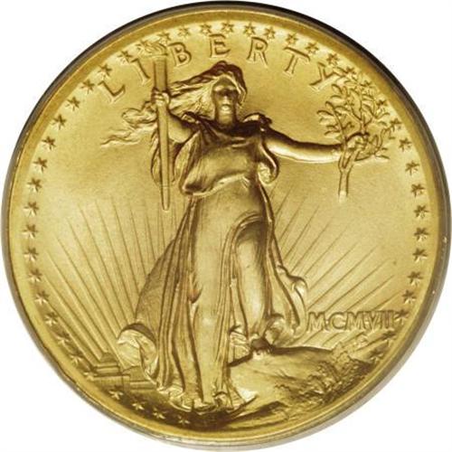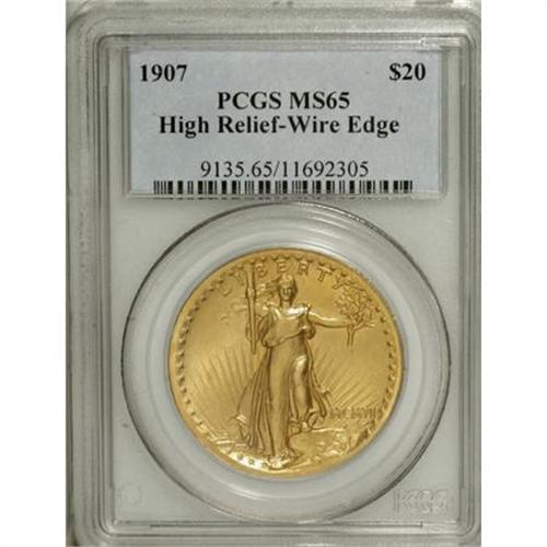 <B>1907 $20 High Relief, Wire Rim MS65 PCGS.</B></I> What a pity that the very nature of this magnificent coin caused it to be minted in such relatively modest numbers! There is a beauty in every Saint-Gaudens double eagle, but not to the extent that beauty reigns on superb pieces made to match the original conception of the artist, in high relief, with all details struck boldly--to mesmerize the human eye!<BR> Countless words have been written about this coin, but how many collectors have ever considered its symbolism, especially compared to the symbolism portrayed on the first double eagle, of the Liberty Head style? On the earlier coin, we see emblematic structure, familiar to most collectors and admired by nearly all. Yet, by its nature, it is static, formal, handsomely stark but without “life.” Surrounding the left-facing head of Liberty are 13 stars, each of six points. The date in Arabic numerals appears below, easy to read. Otherwise, the obverse is void, an intentionally open field meant to offset the very concept of Liberty. On the reverse appear our nation’s name and the denomination, spelled out clearly. The eagle here is diminutive, strictly emblematic, but “emblazoned” by short rays rising from its shoulders with a sort of halo of stars above the bird’s head. The coin is a study in formality.<BR> By contrast, Augustus Saint-Gaudens’ Liberty approaches us! She is striding forward (into the future?). It is Liberty itself here that is “alive,” while the government she represents is diminutive, at her skirt tips. The date is unimportant in this artistic scheme. It is not even readily readable, for it is in Roman numerals. The rays here are long and shine brightly! They gleam, they surround the concept of Liberty, they embolden the very nature of freedom. Numerous stars encircle, representing not only the states of the Union but outlining the proclamation of Liberty. And the reverse--oh, the reverse! Again, the rays blaze away, shine below and lift the American eagle, now no longer a mere emblem but animated, flying, and free! As the United States of America herself was, in 1907, on the verge of becoming an international power, for the first time ever, our wings were about to carry us into a bright and bold future--as indeed our national pride proclaims on this golden coin. It was important, too, that it was a gold coin, money in any language, and for all time.<BR> This Wire Rim example is poised at the threshold of perfection. The thick, satiny surfaces glow with mint luster. There are no contact marks visible to the unaided eye, and the striking definition is complete on each side. A magnificent High Relief and a coin that will surely take bidders' breath away.<BR><BR><b>Shipping:</b> Coins & Currency (<a target="_blank" href="http://www.heritageauctions.com/common/shipping.php">view shipping information</a>)